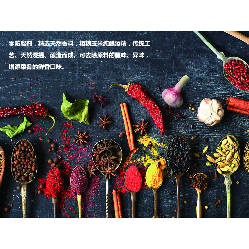 本産品零防腐劑,精選天然香料,粗糧玉米純釀酒精,傳統工藝、天然浸提、釀造而成。可(kě)去除原料的腥味、異味,增添菜肴的鮮香口味。